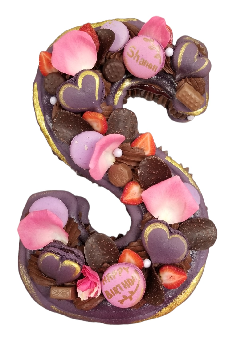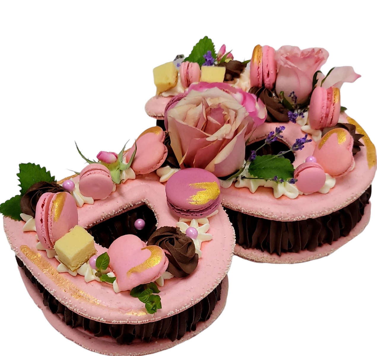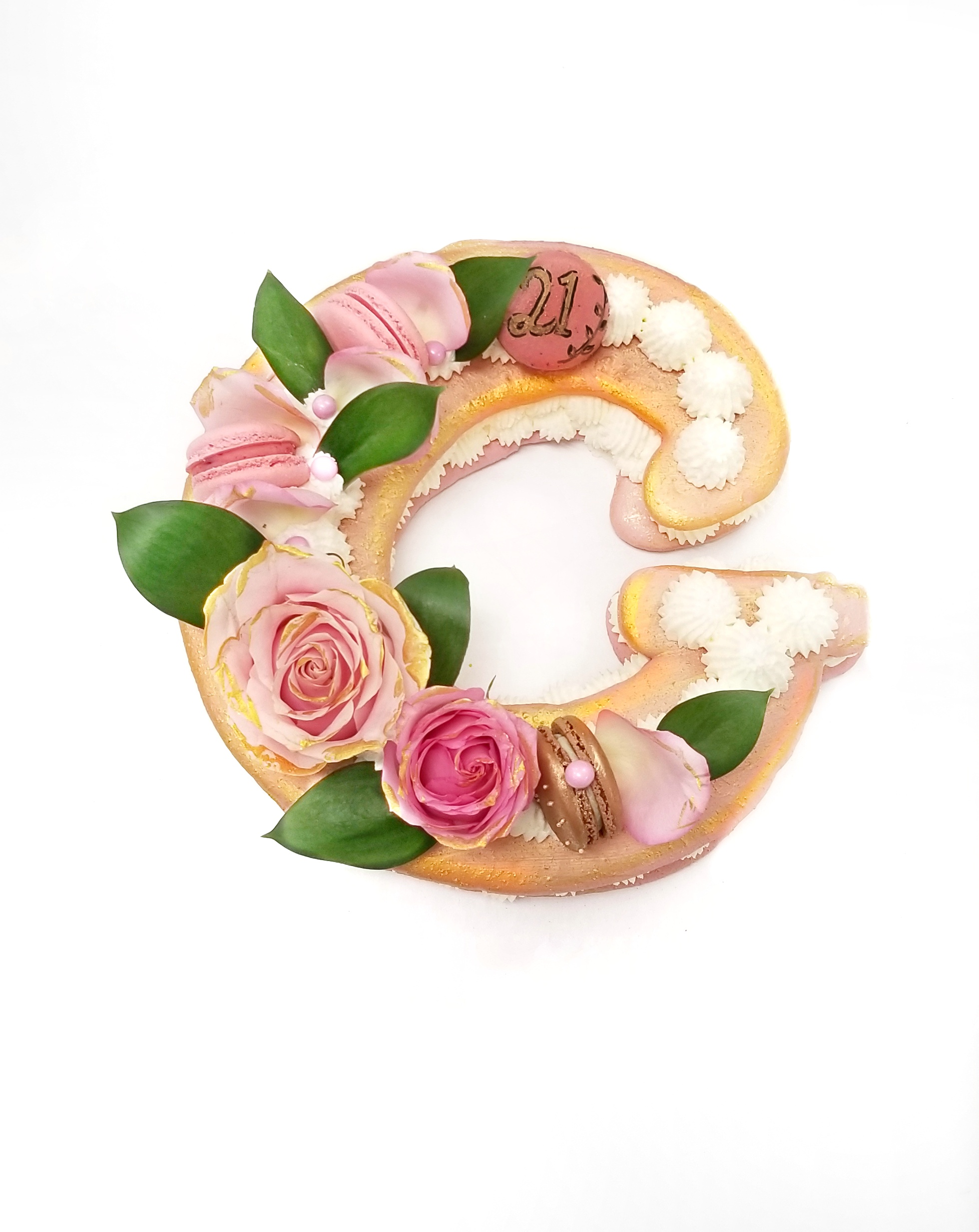 as a decoration this cake has 2 Macarons as decoration with seasonal fruit of edible flowers . EXTRA CHARGE WILL APPLY IN THE STORE IF YOU WOULD LIKE MORE THAN 2 MACARONS AND OR CUSTOM MESSAGE ON MARONS TO BE ON THE CAKE.