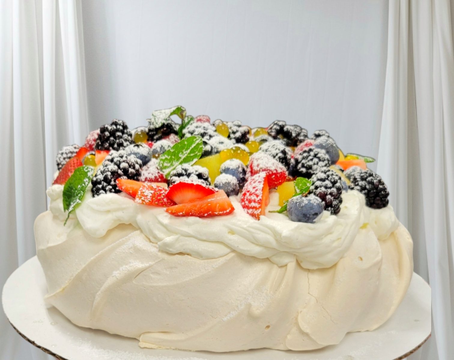 Cloud light meringue with fluffy marshmallow texture center topped with fresh mascarpone cream – tangy lemon curd and fresh berries & seasonal fruits