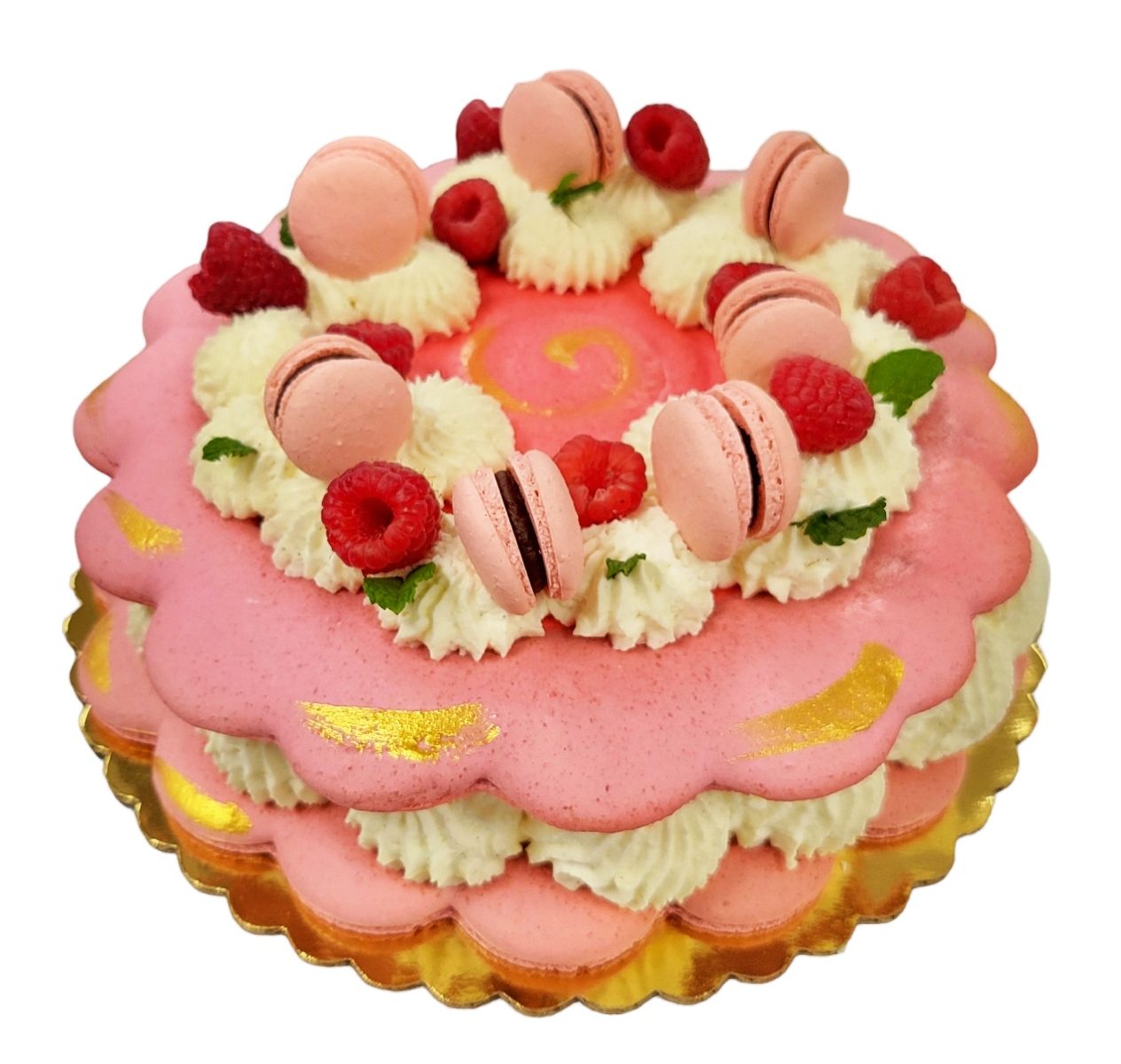 Vanilla Berry flavor : A French modern Macaron cake for any occasion. This cake is a subtle blend of Vanilla cream patisserie (soft and smooth flan), Crème Chantilly, sponge cake pieces, berries and finished with fresh fruits and cream – 2 French Macarons on top as decorations. Any writing on a Macarons or any extra Macarons will be an extra charge.