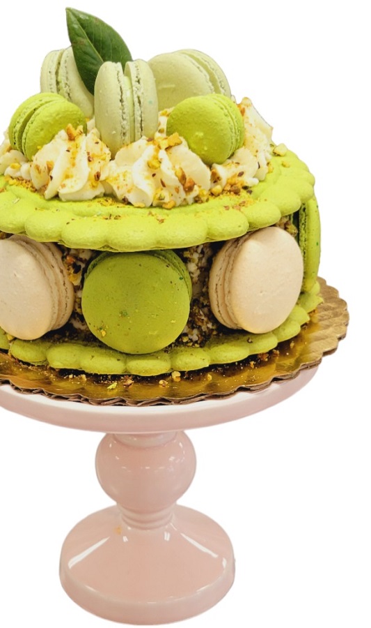 7″ serves up to 10 – soft & delicate chiffon cake, delicious salted Italian pistachio, hint of lemon & French vanilla cream Macaron decoration