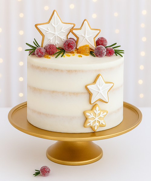 This festive three-layer Christmas cake serves 8 and features a delicate vanilla sponge infused with subtle hints of lemon and orange zest. Cloaked in silky Italian buttercream, its snowy white finish evokes a wintry charm. The cake is adorned with intricately iced star-shaped cookies resembling snowflakes, sugared cranberries, and fresh rosemary sprigs—creating a magical forest-like tableau. Presented on a gold pedestal and softly lit with holiday glow, it’s a showstopping centerpiece that blends elegance with cozy seasonal warmth. Perfect for gifting or gathering, each slice offers a bright, citrus-kissed bite wrapped in creamy indulgence.