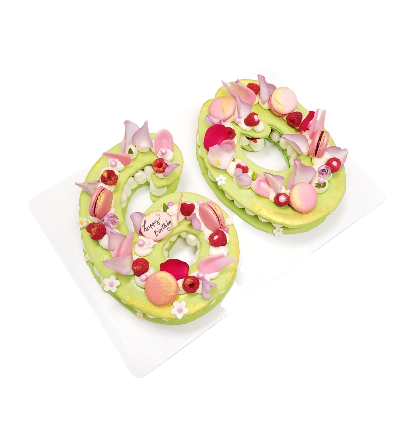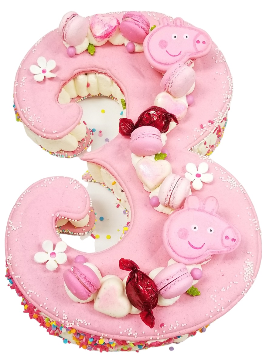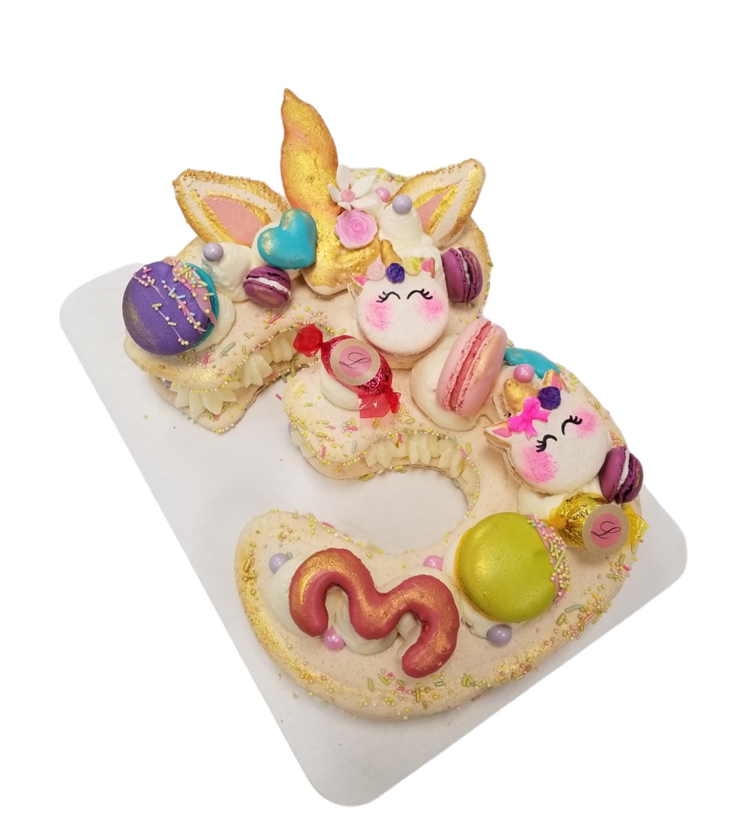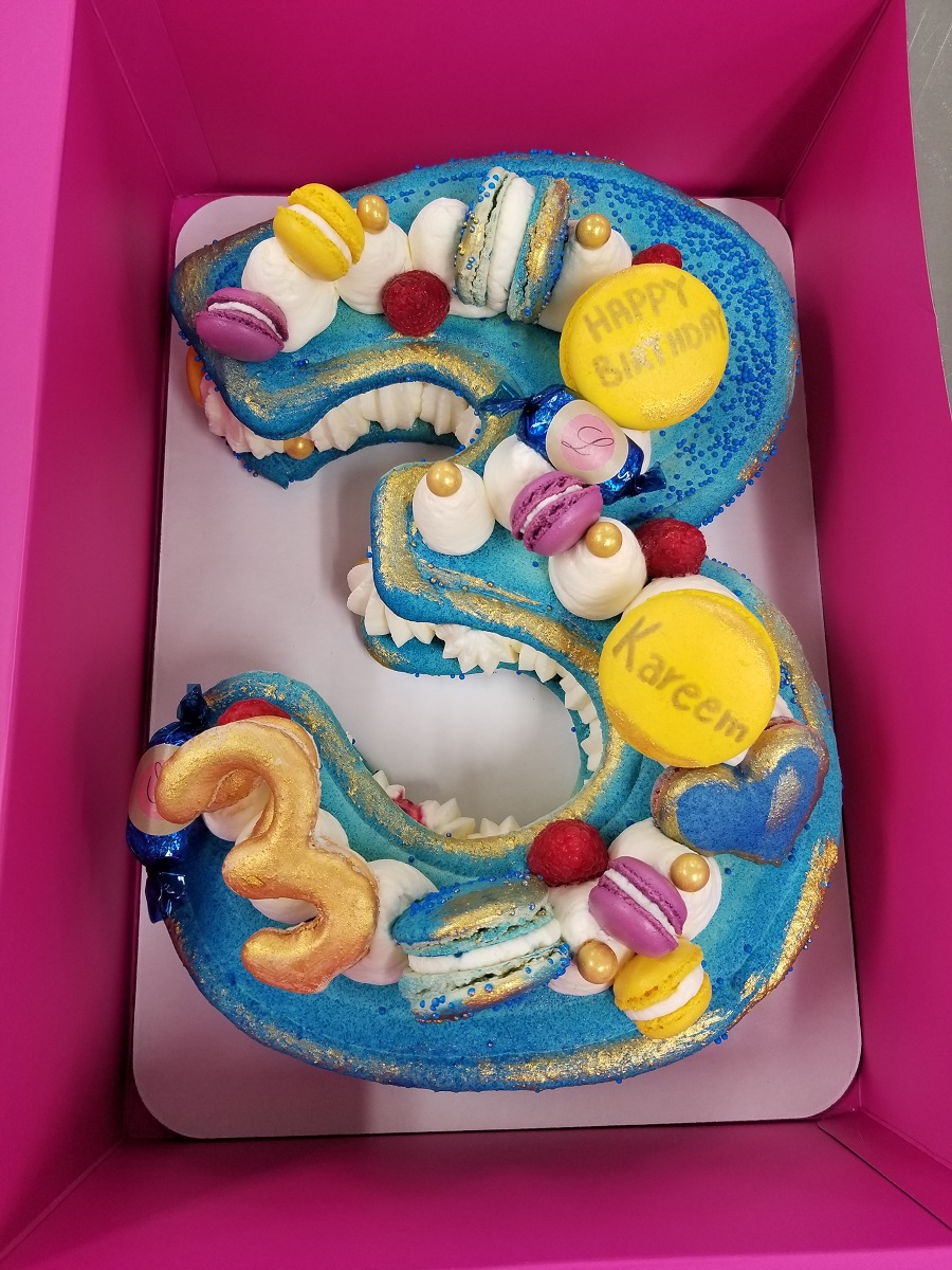 This cake has 3 Macarons as decoration with seasonal fruit of edible flowers . EXTRA CHARGE WILL APPLY IN THE STORE IF YOU WOULD LIKE MORE THAN 3 MACARONS AND OR CUSTOM MESSAGE ON MARONS TO BE ON THE CAKE.