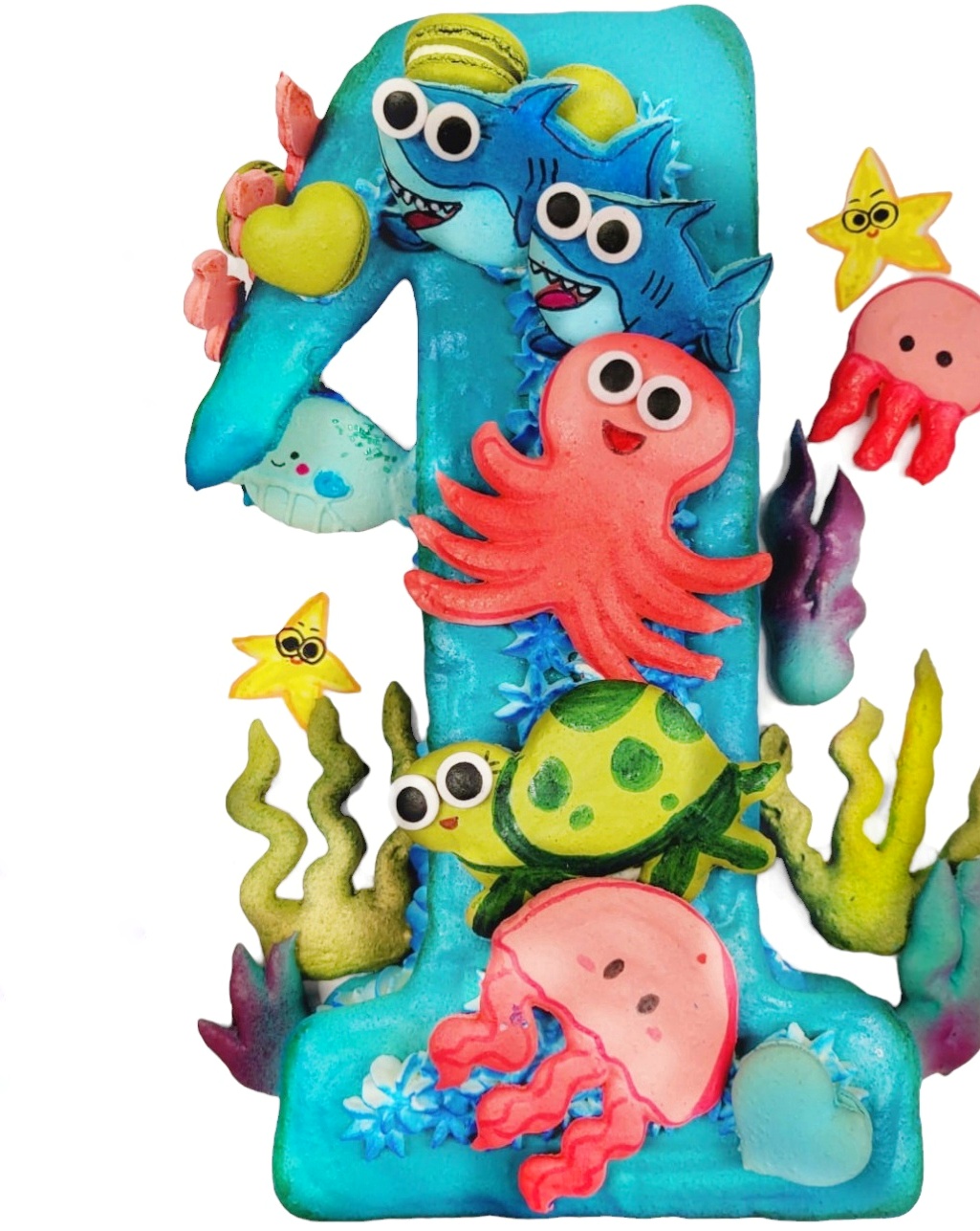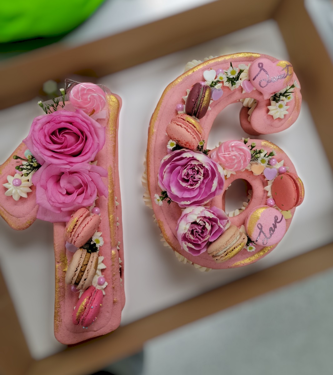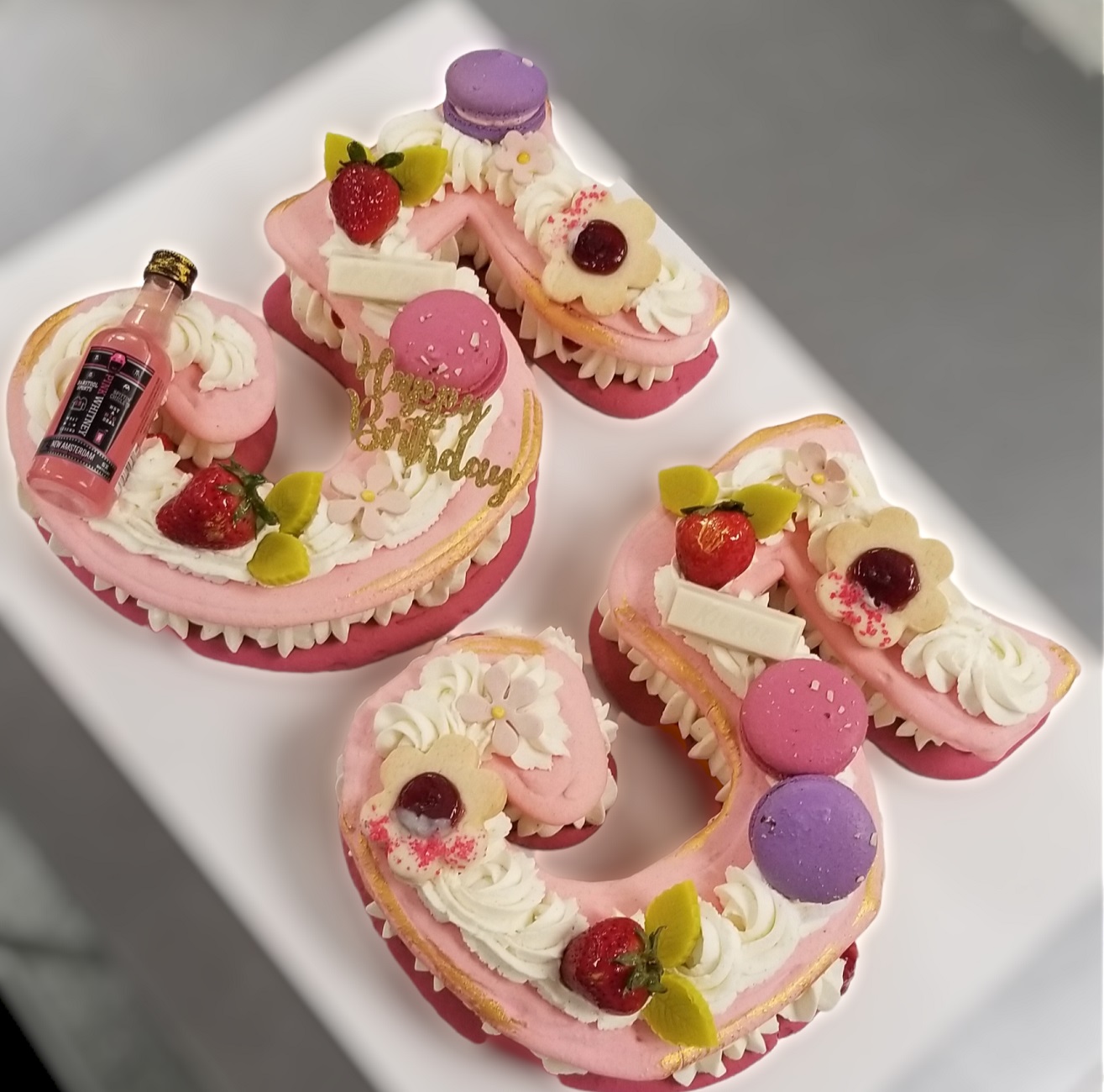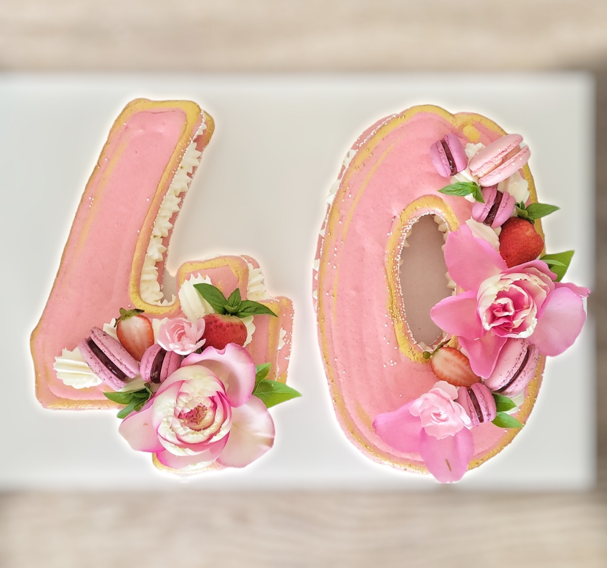 This cake has 3 Macarons as decoration with seasonal fruit of edible flowers . EXTRA CHARGE WILL APPLY IN THE STORE IF YOU WOULD LIKE MORE THAN 3 MACARONS AND OR CUSTOM MESSAGE ON MARONS TO BE ON THE CAKE.