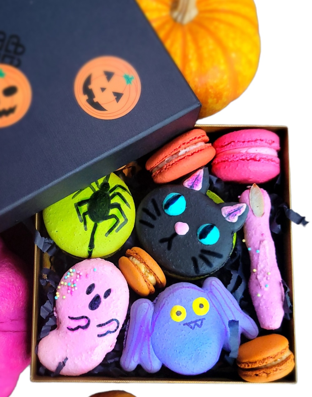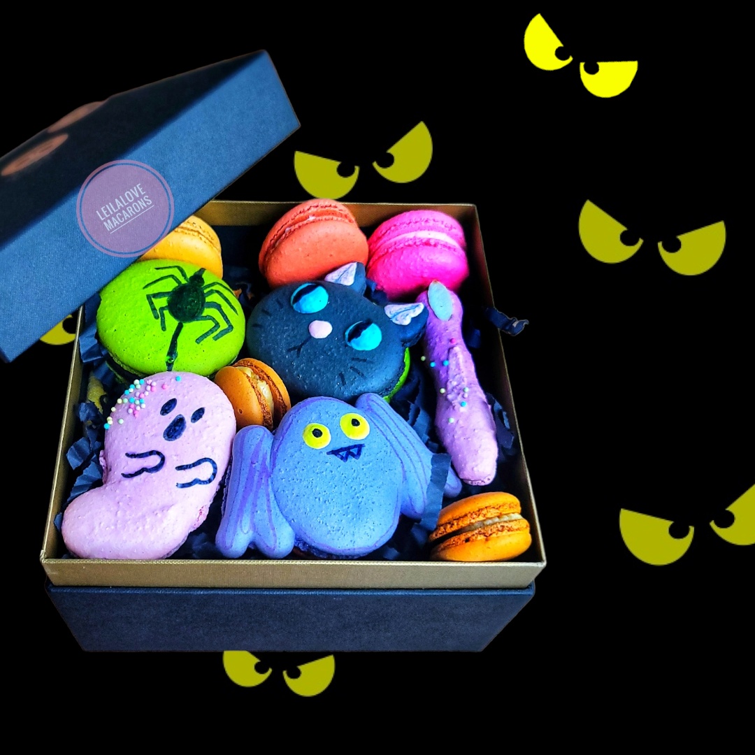 One black cat/One Bat/One ghost/One spider/Two witch fingers/ 3 colorful classic Macarons