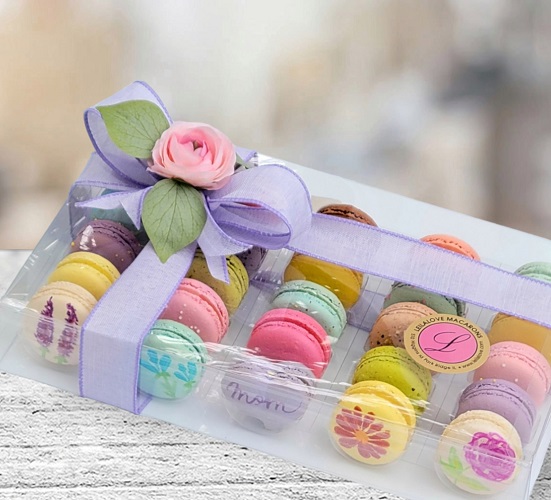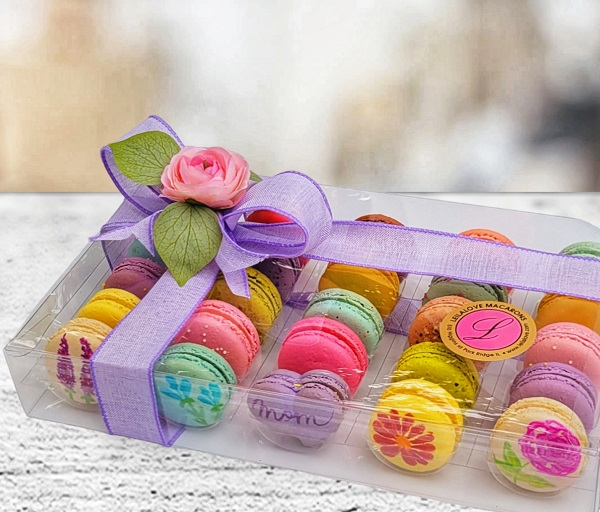 English Garden includes 25 signature seasonal flavors – 5 floral Macarons – 20 most famous French flavors – Special mothers day flavors included – Pistachio – almond – milk chocolate – rose – lavender – blueberry – strawberry – peach blossom – mango pineapple – French vanilla – Lemon cream – white chocolate pistachio – Rubby berry chocolate