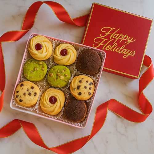 A handcrafted treasure trove of buttery indulgence, this cookie box features four exquisite shortbread varieties nestled in a soft ivory tray, each one a celebration of texture, flavor, and festive warmth: