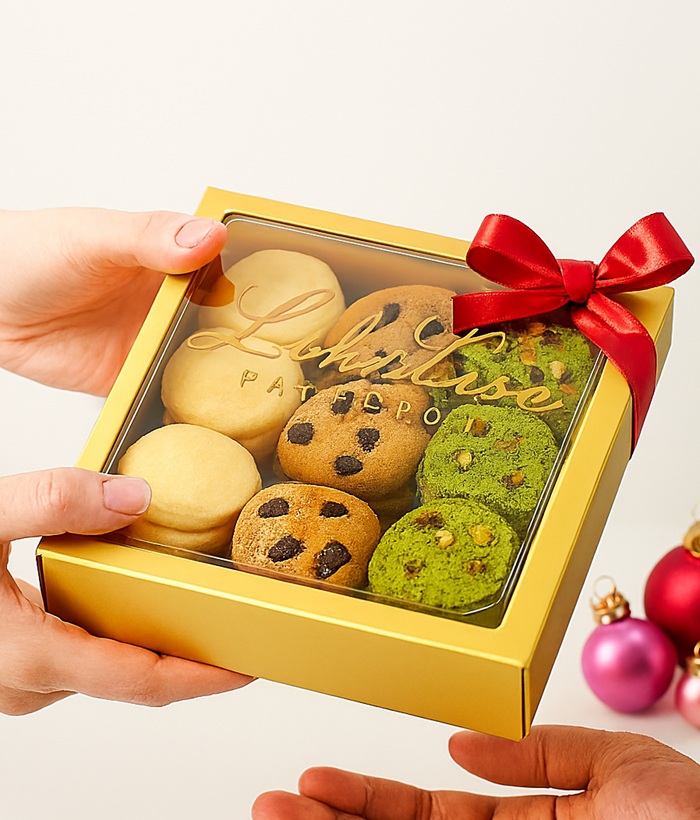 A handcrafted treasure trove of buttery indulgence, this cookie box features four exquisite shortbread varieties nestled in a soft ivory tray, each one a celebration of texture, flavor, and festive warmth: