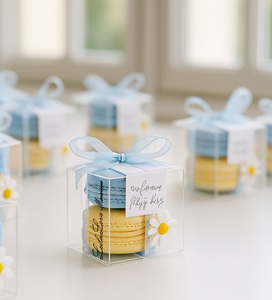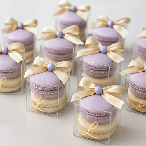Delight your guests with a dozen beautifully packaged macaron favorsāeach box containing two handcrafted French macarons stacked in a clear case and tied with a satin ribbon. Choose your own macaron colors, flavors, and ribbon style to match your eventās theme, whether itās a wedding, baby shower, birthday, or corporate celebration.