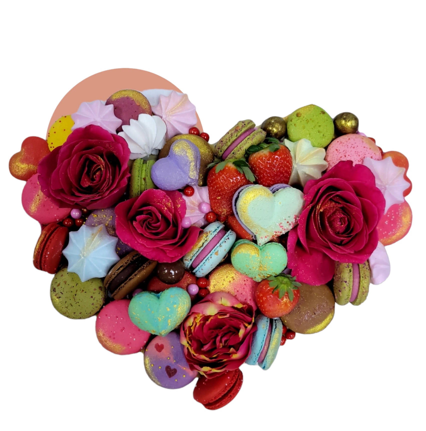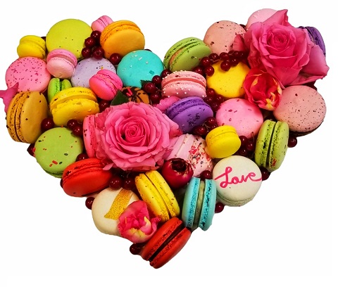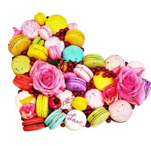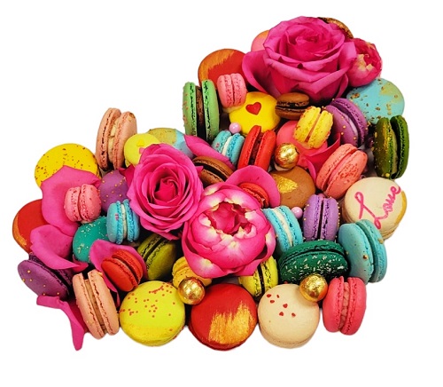 This elegant heart arrangement made with 25 gourmet Macarons, rose flowers and cookies and beautifully packed in a large window box