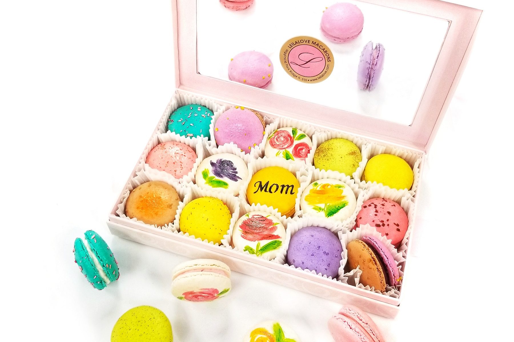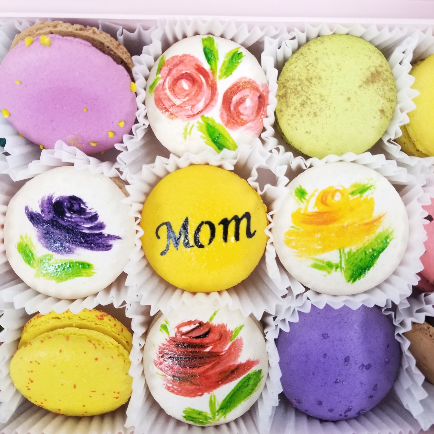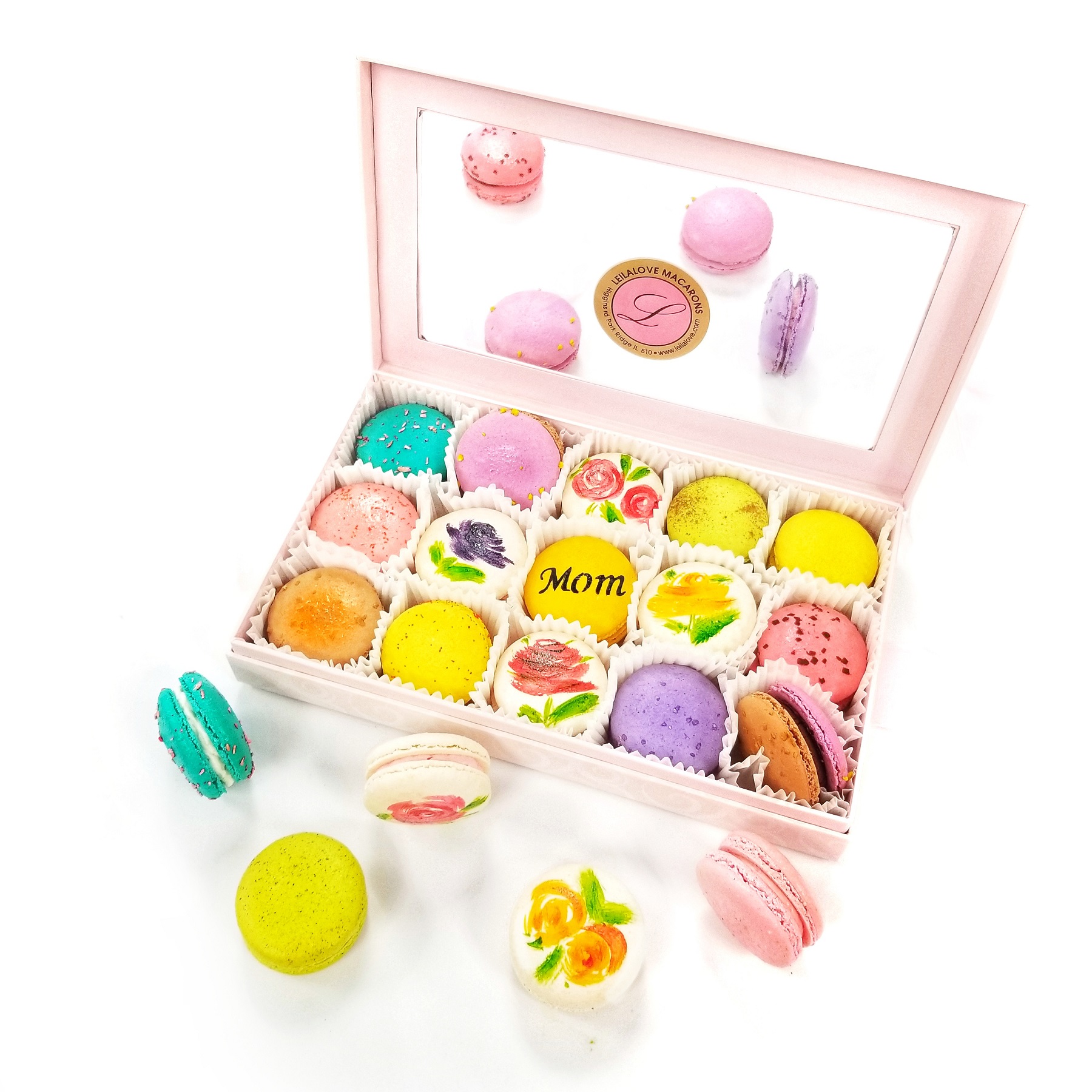 Delicious beautiful and unique gifts with a classy pink collectable gift box for Moms – 4 Hand painted floral Macarons, one Hand written MOM Macarons and 10 delicious classic Macarons