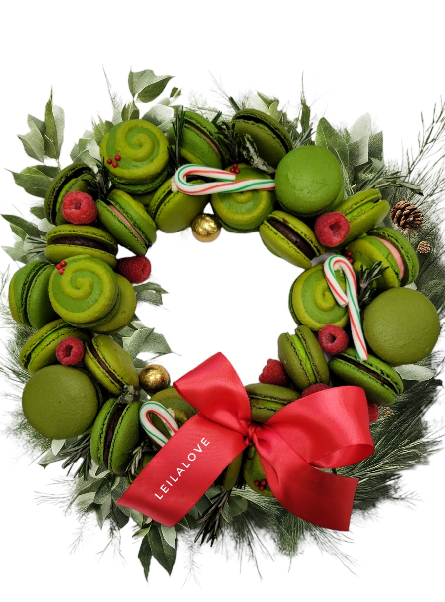 This beautiful wreath arrangement made with 40 Macarons ( Chocolate , pistachio. raspberry) fresh raspberry & cranberry & seasonal greens – Perfect elegant Christmas gift